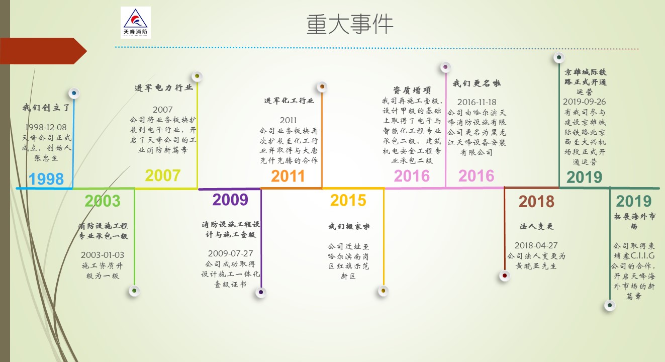 9U平台(以下简称:天峰消防)创立于1998年,主要承接能源化工、石化、电力、轨道交通、冶金、城市管廊等工业行业消防系统工程,可为客户提供特殊消防系统的详细设计、供货、施工等集成服务,天峰消防将依靠自身实力和信誉实现“立足龙江,布局全国,走向海外”的目标。